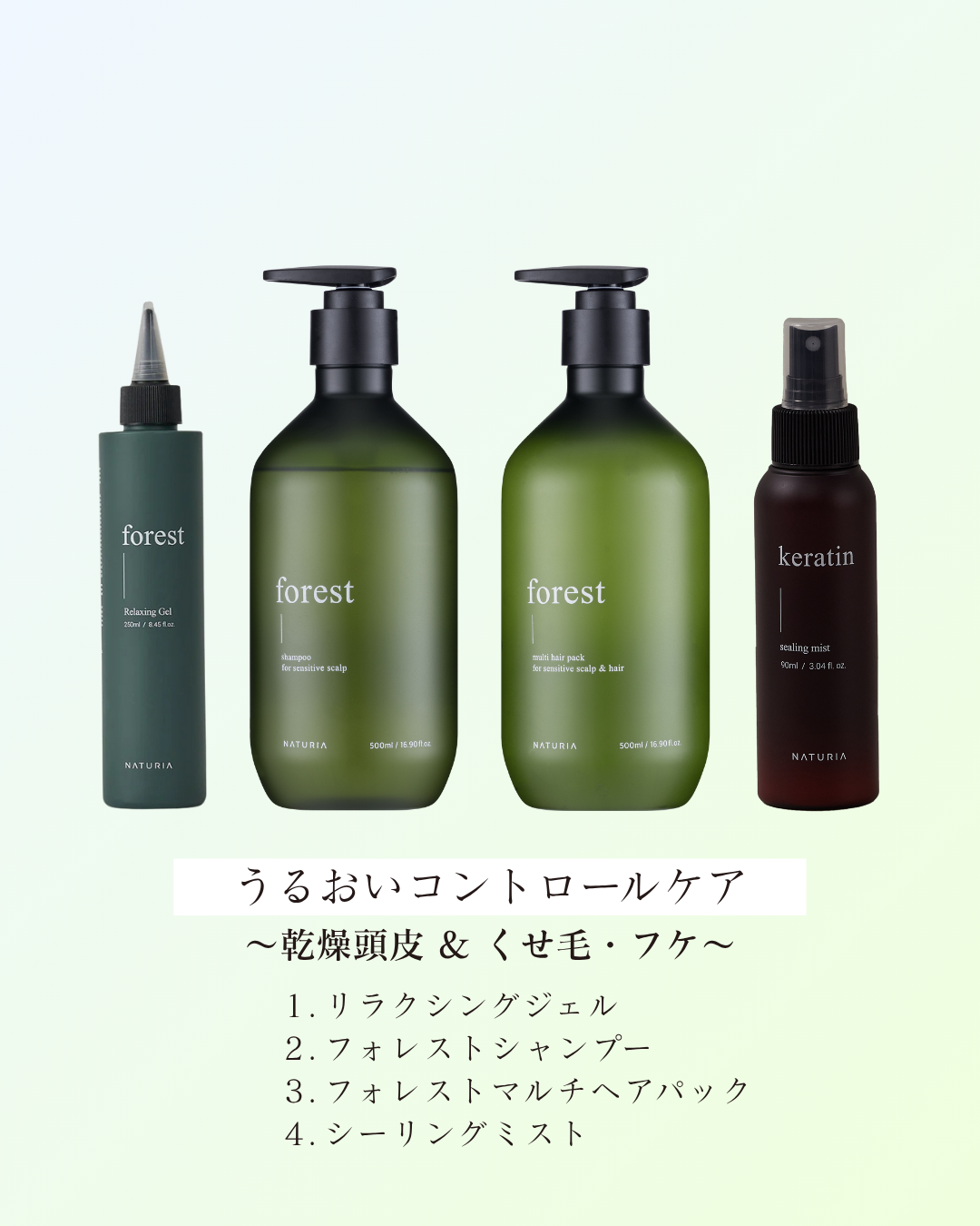 NATURIA お悩みセット④うるおいコントロールケア~乾燥頭皮 & くせ毛・フケ~(リラクシングジェル、フォレストシャンプー、フォレストマルチヘアパック、シーリングミスト)です。