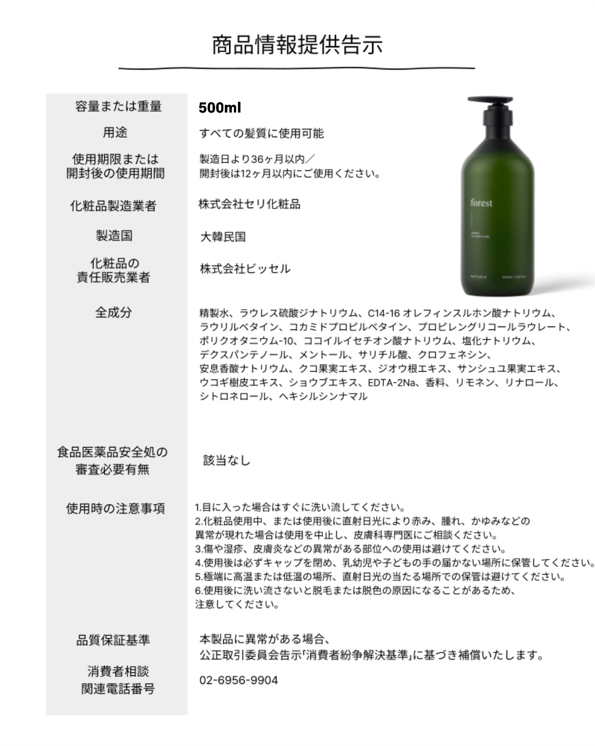容量: リラクシングジェル 250ml、フォレストシャンプー 500ml、フォレストマルチヘアパック 500ml、シーリングミスト200ml