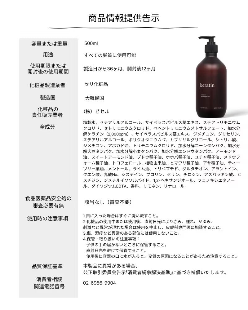 ケラチンシャンプー 500ml、ケラチントリートメント 500ml、ケラチンノーリッシングヘアマスク 300ml、ウォーターパック 250ml