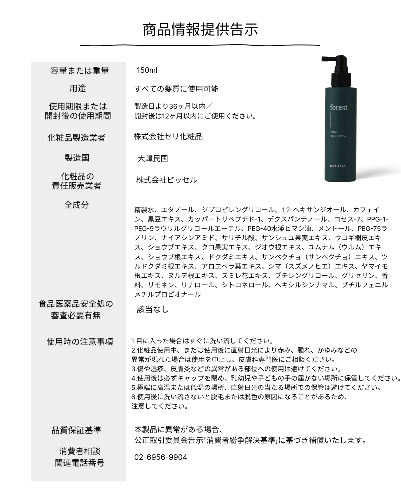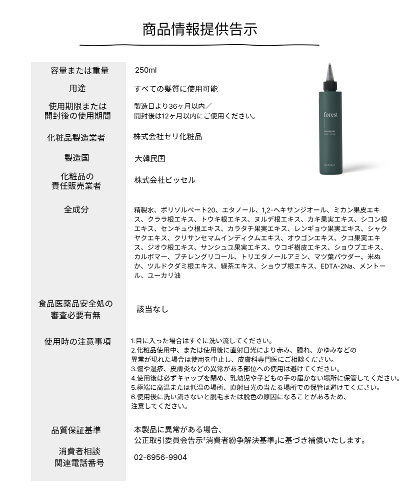 フォレストシャンプー 500ml、フォレストマルチヘアパック 500ml、フォレストリラクシングジェル 250ml、フォレストスカルプトニック 150ml