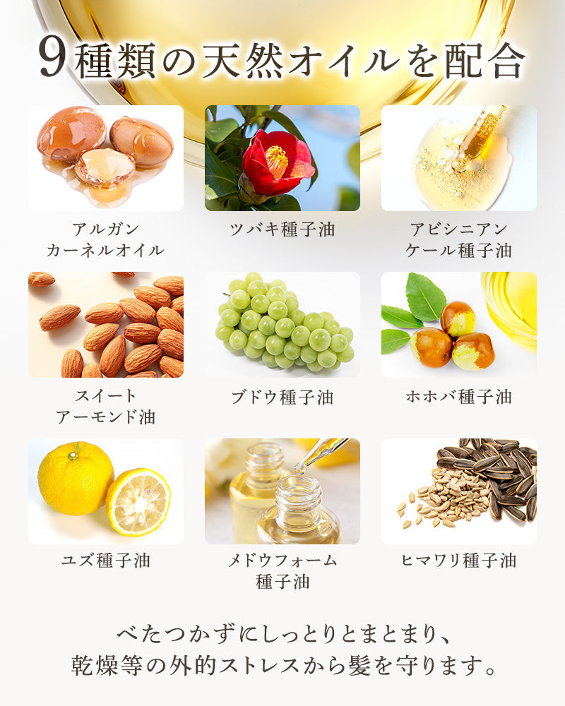 ナインオイルは、アルガンオイルをベースに9種の植物由来オイルをブレンド。