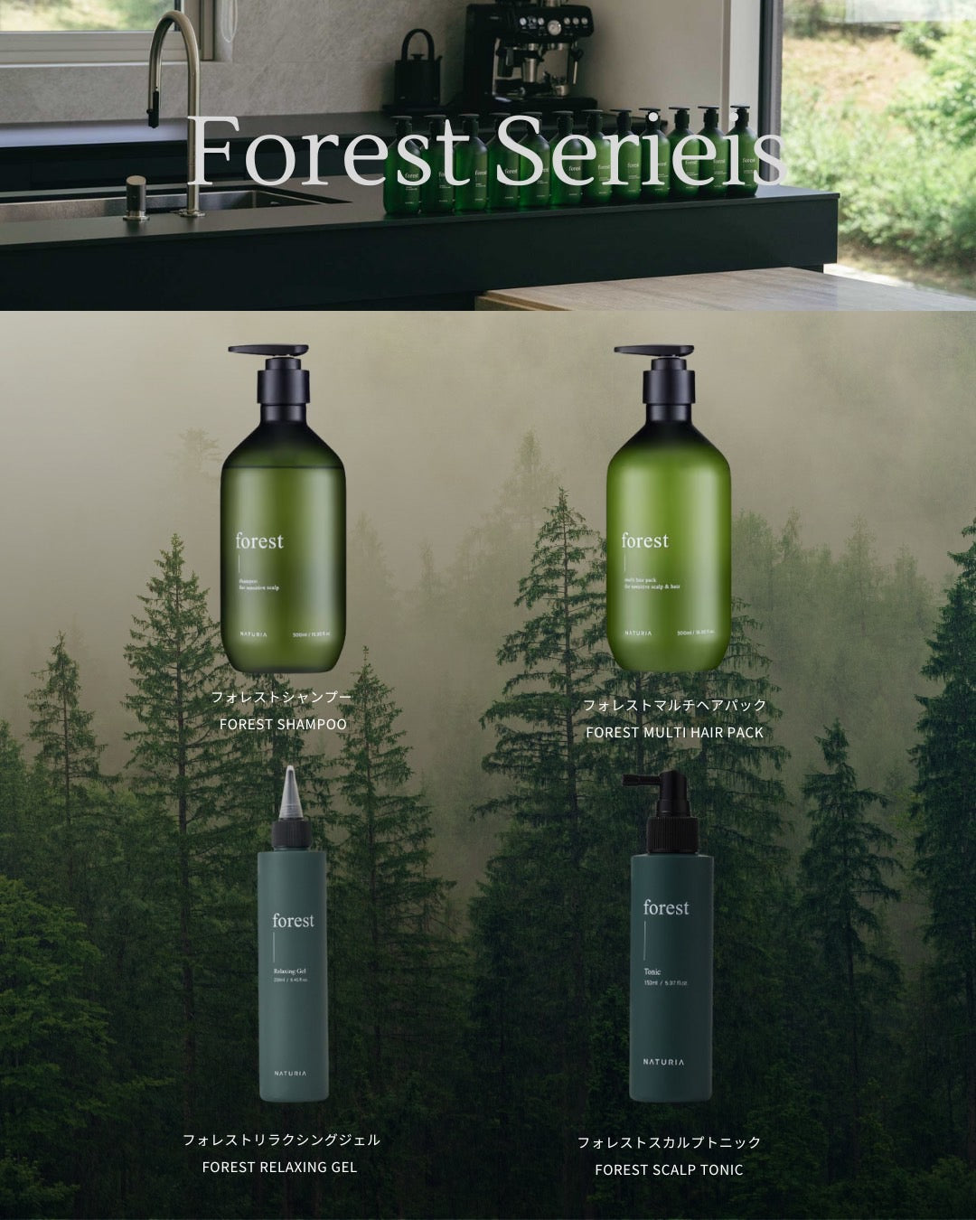 NATURIA フォレストシリーズ 4点セット(フォレストシャンプー,フォレストマルチヘアパック,フォレストリラクシングジェル,フォレストスカルプトニック)です。